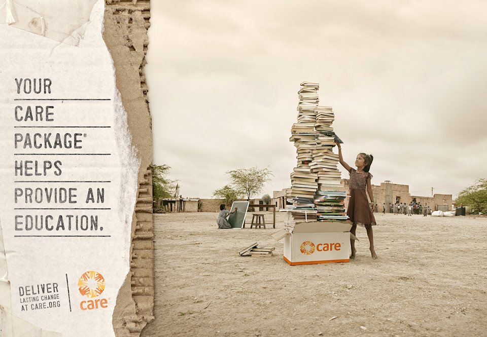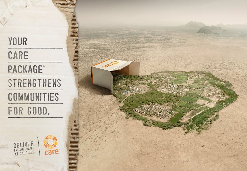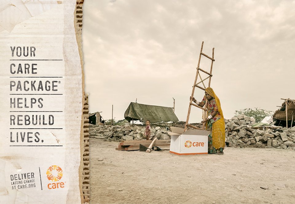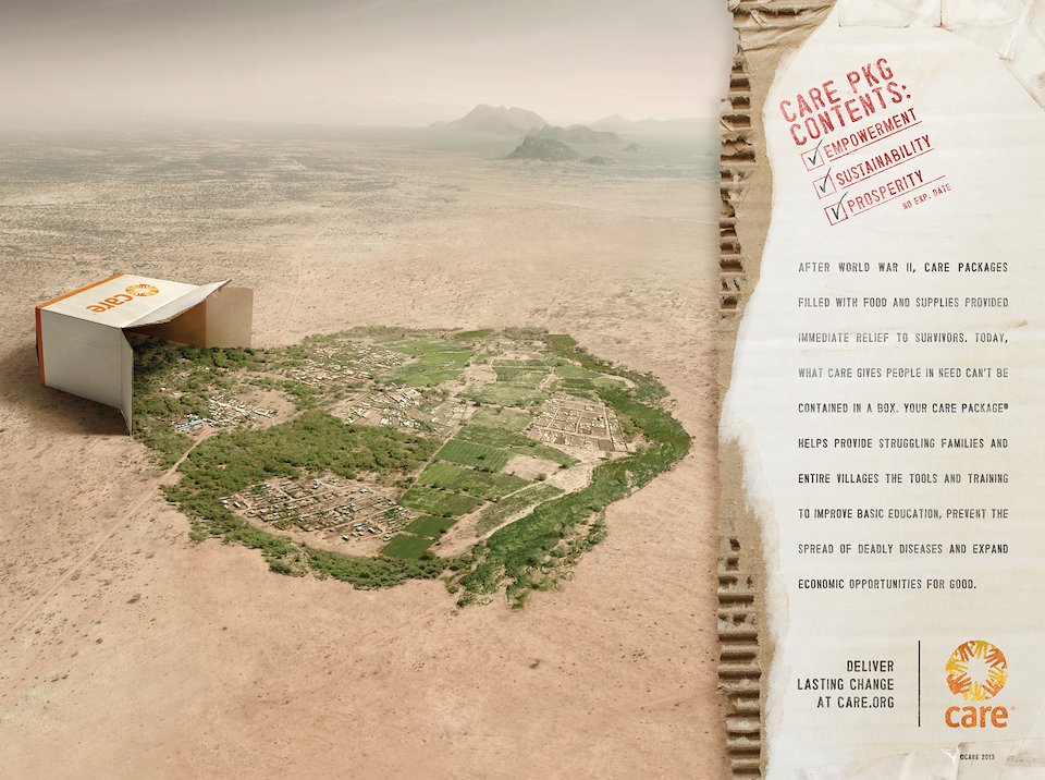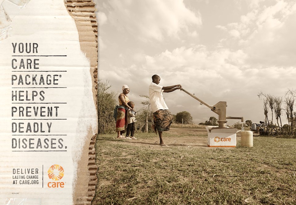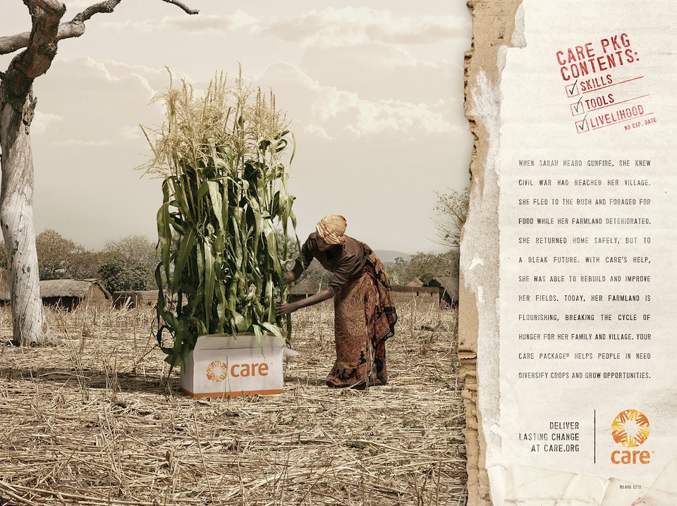 Body Copy: After World War II, CARE Packages filled with food and supplies provided immediate relief to survivors. Today, what CARE gives people in need can’t be contained in a box. Your CARE Package® provides struggling families and entire villages the tools and training to improve basic education, prevent the spread of deadly diseases and expand economic opportunities for good.