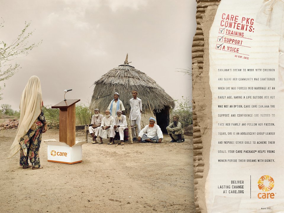 Body Copy: Sanjana’s dream to work with children and serve her community was shattered when she was forced into marriage at an early age. Having a life outside her hut was not an option. CARE gave Sanjana the support and confidence she needed to face her family and follow her passion. Today, she is an adolescent group leader and inspires other girls to achieve their goals. Your CARE Package® helps young women pursue their dreams with dignity.