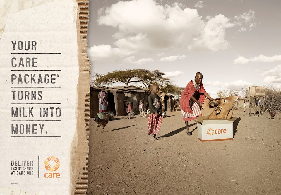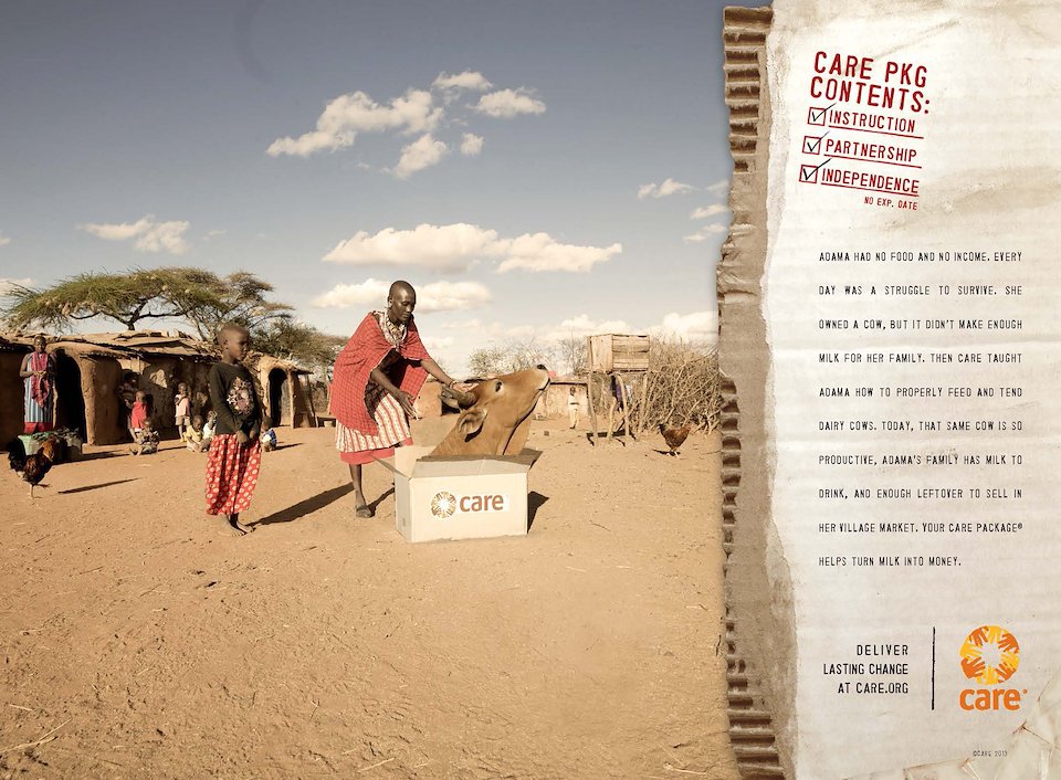 Body Copy: Adama had no food and no income. Every day was a struggle to survive. She owned a cow, but it didn’t make enough milk for her family. Then CARE taught Adama how to properly feed and tend dairy cows. Today, that same cow is so productive, Adama’s family has milk to drink, and enough left over to sell in her village market. Your CARE Package® helps turn milk into money.