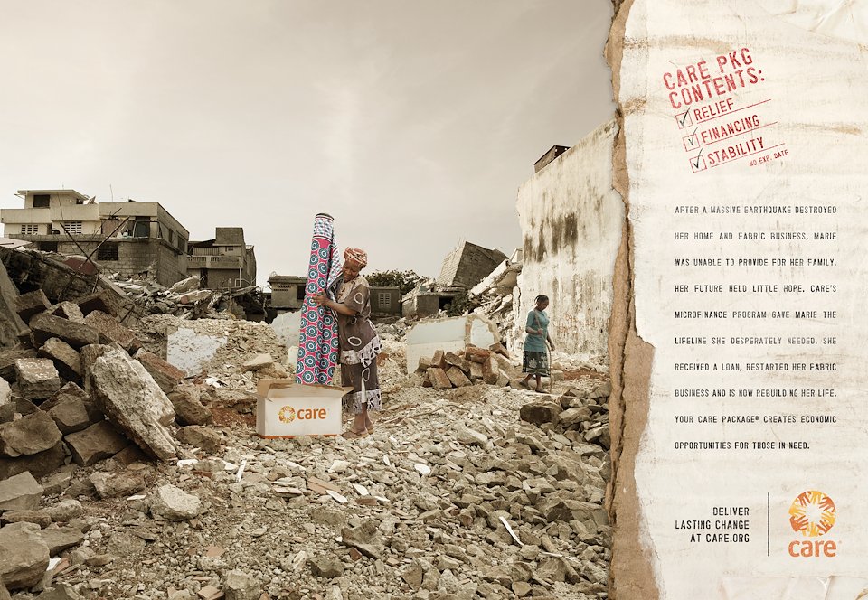 Body Copy: After a massive earthquake destroyed her home and fabric business, Marie was unable to provide for her family. Her future held little hope. CARE’s Microfinance program gave Marie the lifeline she desperately needed. She received a loan, restarted her fabric business and is now rebuilding her life. Your CARE Package® creates economic opportunities for those in need.